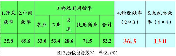 2.能源效率低,產品能耗與國際先進水平有較大差距。我國的開采效率是35.8%;中間效率包括運輸、轉換等,在69.6%;終端的利用效率,工業53.4%,農業33%,交通的更低,這些總的綜合在一起是52.2%,最后再乘以中間效率、開采效率,我們整個能源系統的總效率只有13%,跟國外相比大概差了10個百分點。(見圖2)