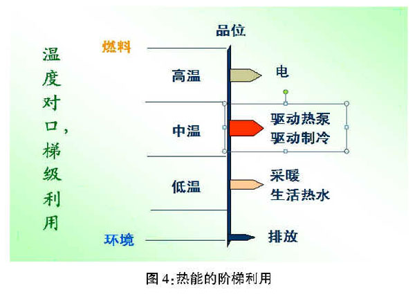 熱能的階梯利用(見圖4)就是指把燃料產生的高溫氣體進行回收,高溫的用來發電,中溫的用來制冷,低溫的用來采暖和生活用水,剩下的一小部分再排放出來,這就是我們通常講的溫度對口,梯級利用。我們要采用先進的燃燒技術,包括水煤漿、煤粉燃燒,還有現在正在考核的高溫空氣燃燒技術等。這里要注意一個問題,為了提高換熱的效果,我們常常會增加流速,而增加流速的同時能耗也會增加,所以我們要把這兩者協調處理。