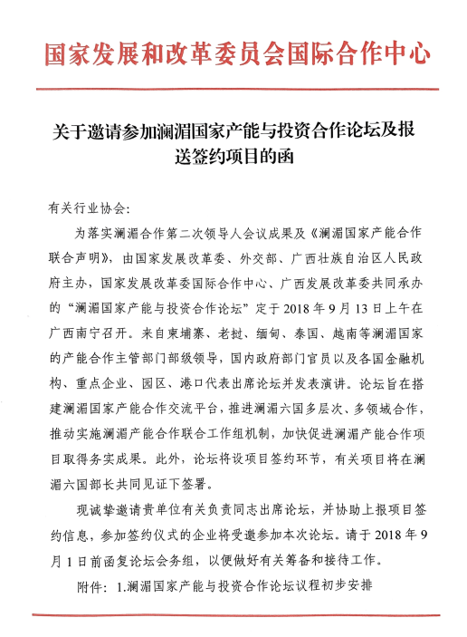 附件:《關于邀請參加瀾湄國家產能與投資合作論壇及報送簽約項目的函》
