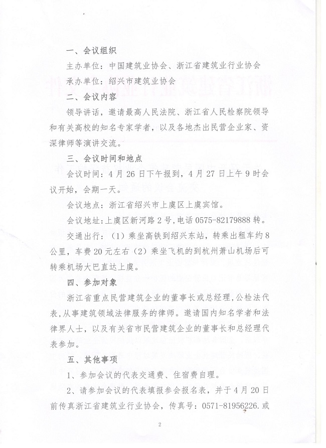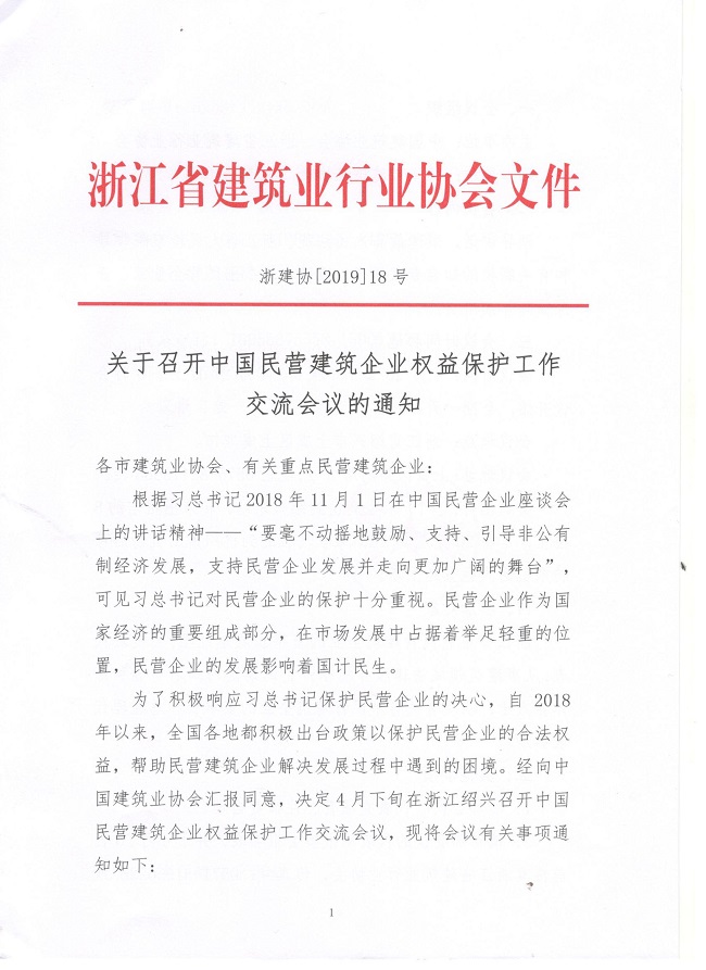 為全面貫徹習(xí)近平總書記在民營(yíng)企業(yè)座談會(huì)上的重要講話精神,貫徹落實(shí)黨中央、國(guó)務(wù)院支持民營(yíng)企業(yè)改革發(fā)展的決策部署,支持和推動(dòng)民營(yíng)建筑企業(yè)發(fā)展,我會(huì)決定與浙江省建筑業(yè)行業(yè)協(xié)會(huì)在浙江紹興聯(lián)合召開中國(guó)民營(yíng)建筑企業(yè)權(quán)益保護(hù)工作交流會(huì),深入研究民營(yíng)建筑企業(yè)發(fā)展過(guò)程中遇到的困難和問(wèn)題,切實(shí)維護(hù)企業(yè)合法權(quán)益,大力支持民營(yíng)建筑企業(yè)發(fā)展壯大。請(qǐng)貴協(xié)會(huì)推薦本地區(qū)或本行業(yè)兩到三家民營(yíng)企業(yè)參會(huì)(每家不超過(guò)2人)。會(huì)議安排詳見(jiàn)附件。