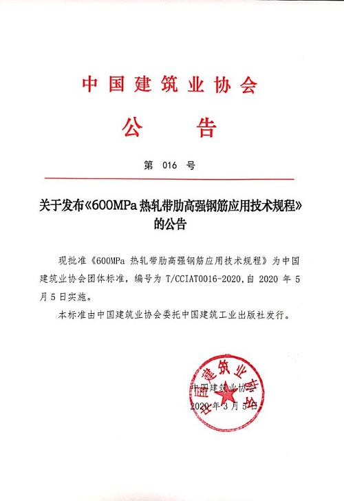 關于發布《600MPa熱軋帶肋高強鋼筋應用技術規程》的公告