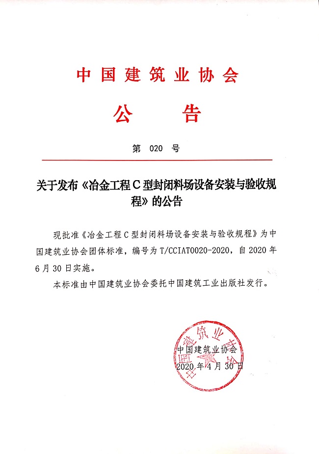 關(guān)于發(fā)布《冶金工程C型封閉料場設(shè)備安裝與驗收規(guī)程》的公告
