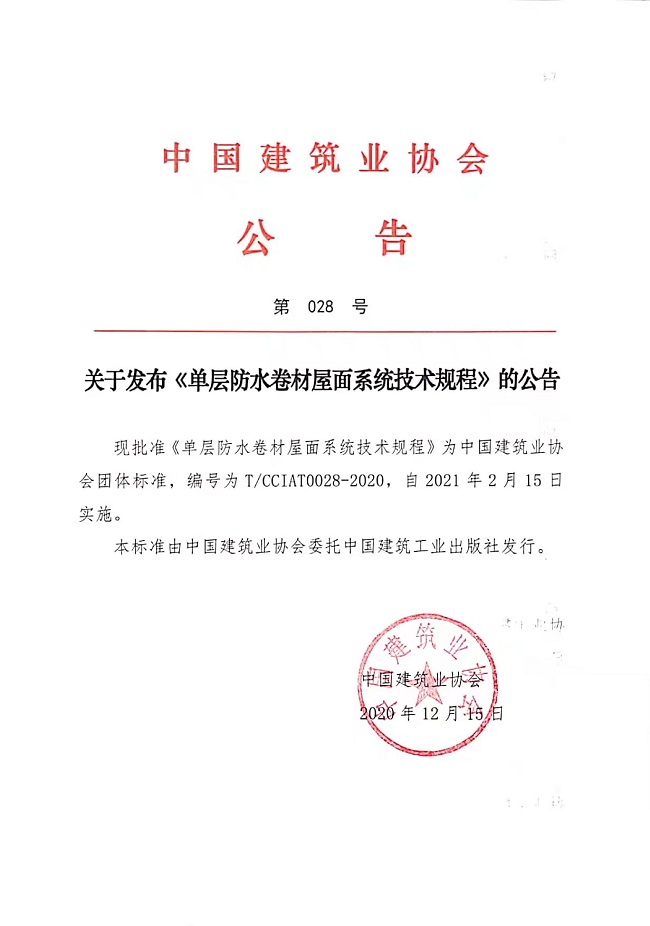 關于發布《單層防水卷材屋面系統技術規程》的公告