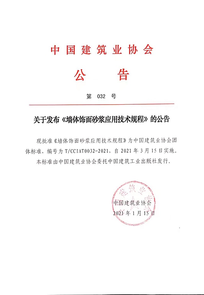 關(guān)于發(fā)布《墻體飾面砂漿應(yīng)用技術(shù)規(guī)程》的公告