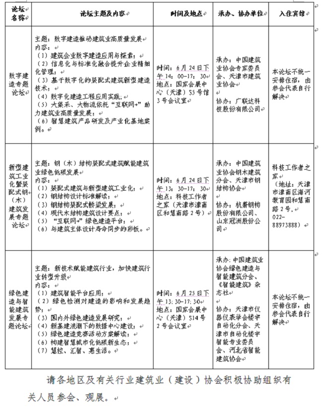 6月24日上午9:30在國家會展中心(天津)舉辦博覽會開幕式。商務部、住房和城鄉建設部、天津市、中國建筑業協會、中國對外貿易中心、中國建筑科學研究院有限公司領導,中國工程院院士、勘察設計大師以及行業專家、企業代表出席開幕式。