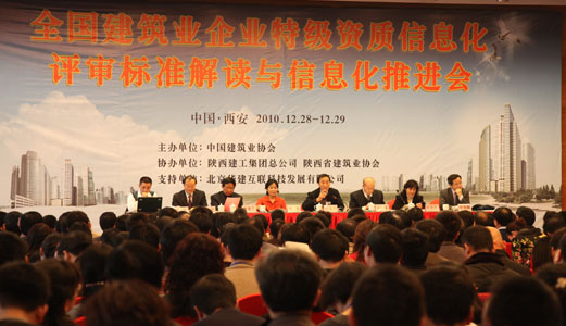 為推動住房城鄉建設部《施工總承包企業特級資質標準實施辦法》和信息化標準的貫徹實施,幫助企業深入了解特級資質就位中的有關政策要求和信息化評審的標準、范圍及重點,促進建筑業企業信息化建設,中國建筑業協會于2010年12月28-29日在陜西省西安市召開了全國建筑業企業特級資質信息化評審標準解讀與信息化推進會。住房和城鄉建設部建筑市場監管司處長燕平、陜西省住房城鄉和建設廳副廳長許龍發、中國建筑業協會副會長兼秘書長吳濤出席會議并講話。來自全國500余家特級、一級施工總承包企業的信息化、項目和資質管理的負責人員參加了會議。會議由中國建筑業協會副秘書長尤完同志主持。