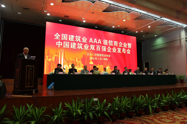 2016年1月7日,中國建筑業協會在珠海隆重召開建筑業AAA級信用企業暨中國建筑業雙百強企業發布會,向北京建工國際建設工程有限責任公司等277家2015年度建筑業AAA級信用企業和中建三局集團有限公司等100家2014年度中國建筑業競爭力百強企業、安徽三建工程有限公司等100家2014年度中國建筑業成長性百強企業,以及97家建筑行業先進協會和88名建筑行業優秀秘書長頒發獎牌和證書。中國建筑業協會會長王鐵宏、副會長兼秘書長吳濤出席會議,副秘書長李蓬主持會議。廣東省住房城鄉建設廳黨組副書記、巡視員陳英松致歡迎辭,各地區和有關行業建設協會和企業代表等共400余人參會。