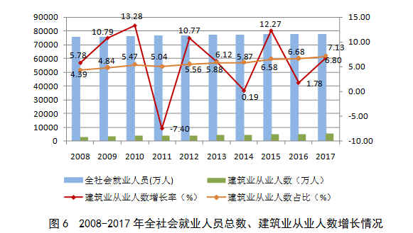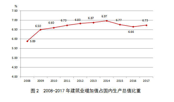 自2009年以來,建筑業增加值占國內生產總值的比例始終保持在6.5%以上。2017年在上年下降的情況下出現回升,達到了6.73%的較高點(圖2),建筑業國民經濟支柱產業的地位穩固。