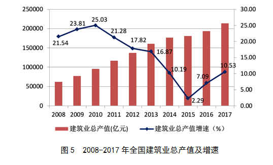 近年來,隨著我國建筑業企業生產和經營規模的不斷擴大,建筑業總產值持續增長,2017年達到213953.96億元,比上年增長10.53%,增速比上年增加了3.44個百分點。建筑業總產值增速結束了2011年至2015年連續5年的下降趨勢,連續兩年出現增長(圖5)。