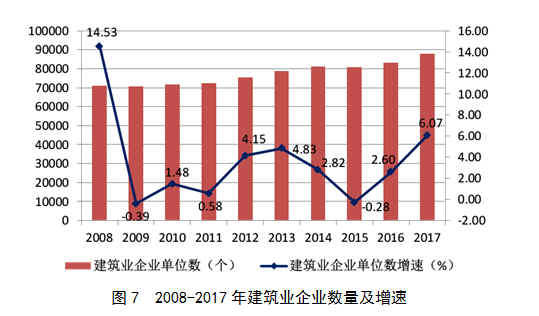 截至2017年底,全國共有建筑業企業88059個,比上年增加5042個,增速為6.07%,比上年增加了3.47個百分點,增速連續兩年增加(圖7)。國有及國有控股建筑業企業6800個,比上年減少14個,占建筑業企業總數的7.72%,比上年下降了0.49個百分點。