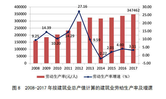 2017年,按建筑業總產值計算的勞動生產率為347462元/人,比上年增長3.11%,增速雖略有下降,但勞動生產率水平創出新高(圖8)。