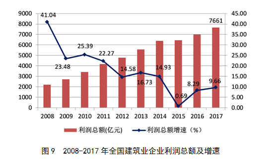 2017年,全國建筑業企業實現利潤7661億元,比上年增加674.95億元,增速為9.66%,增速比上年高1.37個百分點(圖9)。