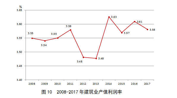 近10年來,建筑業產值利潤率(利潤總額與總產值之比)一直在3.5%上下徘徊。2017年,建筑業產值利潤率為3.58 %,比上年降低了0.03個百分點(圖10)。