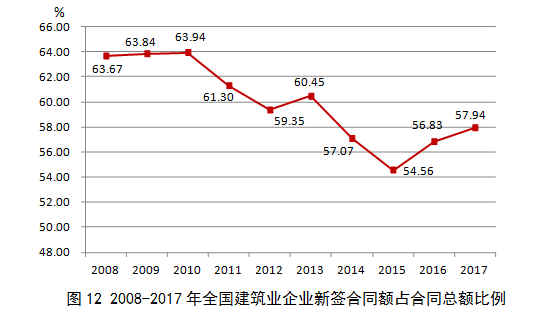 2017年,全國建筑業企業簽訂合同總額439524.36億元,比上年增長18.10%,增速連續兩年增長。其中,本年新簽合同額254665.71億元,比上年增長了20.41%,增速也連續兩年保持增長(圖11)。本年新簽合同額占簽訂合同總額比例為57.94%,比上年提高了1.11個百分點,連續兩年出現增長(圖12)。