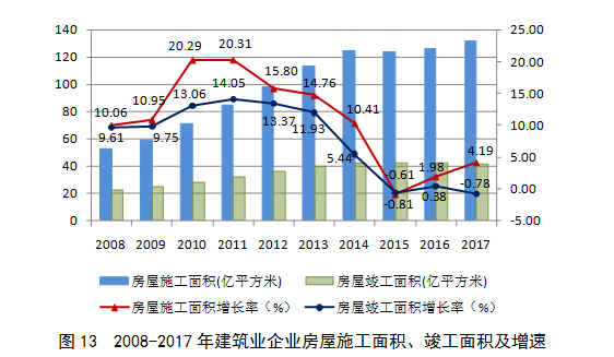 2017年,全國建筑業企業房屋施工面積131.72億平方米,比上年增長4.19%,增速連持續兩年保持增長。竣工面積41.91億平方米,比上年下降0.78%(圖13)。