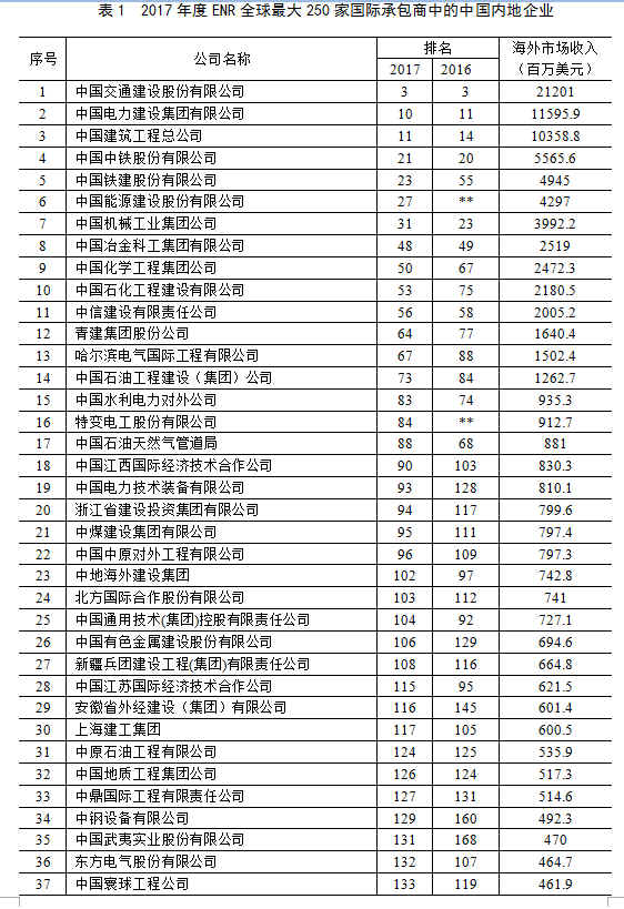 美國《工程新聞記錄》(簡稱“ENR”)雜志公布的2017年度全球最大250家國際承包商共實現營業收入4681.2億美元,比上一年度下降了6.4%,下滑的態勢已經持續了三年,且降幅有了明顯的擴大。我國內地共有65家企業入選2017年度全球最大250家國際承包商榜單,入選數量與上年持平。入選企業共實現海外市場營業收入987.2億美元,比上年增長了5.4%,占250家國際承包商場營業收入總額的21.1 %,比上年提高1.8個百分點。