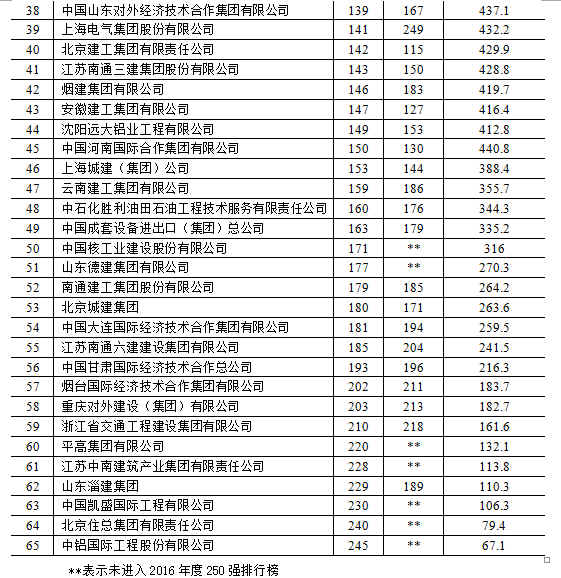65家上榜企業中,有38家企業排名比上一年度有所提升,17家企業排名下降,排名未變的企業1家,新進榜企業9 家。中國交通建設股份有限公司連續10年排名中國上榜企業首位,名次繼續保持在第3位(表1)。