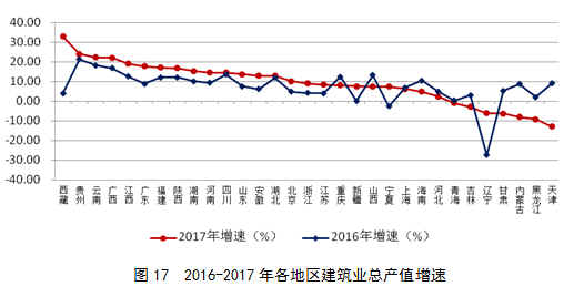 從各地區建筑業總產值增長情況看,有24個地區的建筑業總產值增長,20個地區的增速高于上年。西藏、貴州、云南和廣西分別以32.93%、24.12%、22.22%和22.06 %的增速位居前四位。7個地區的建筑業總產值出現負增長,其中,天津、黑龍江、內蒙古出現了低于-8%的負增長,分別為-12.87%、-9.12%和-8.08%(圖17)。