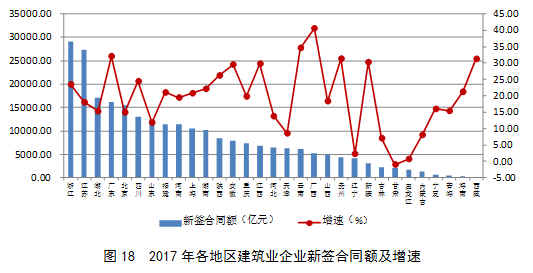 2017年,全國建筑業企業新簽合同額254665.71億元,比上年增長20.41%,增速較上年提高了4.99個百分點。浙江、江蘇兩省建筑業企業新簽合同額繼續占據前兩位,分別達到29036.41億元、27302.47億元,占各自簽訂合同額總量的64.20%、60.83%,且出現較大幅度的增長,分別比上年增長了23.47%和18.07%。新簽合同額超過8000億元的還有湖北、廣東、北京、四川、山東、福建、河南、上海、湖南、陜西等10個地區。新簽合同額增速超過25%的有廣西、云南、廣東、貴州、西藏、新疆、江西、安徽、陜西等9個地區,分別增長40.56%、34.61%、32.07%、31.32%、31.24%、30.25%、29.77%、29.52%、26.19%。甘肅出現了-0.93%的負增長(圖18)。