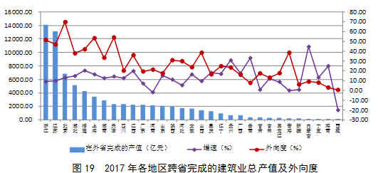 2017年,各地區跨省完成的建筑業產值74389.76億元,比上年增長11.94%,增速同比提高1.56個百分點。跨省完成建筑業產值占全國建筑業總產值的34.77%,比上年提高0.44個百分點。