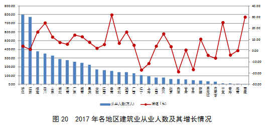 圖20  2017年各地區建筑業從業人數及其增長情況