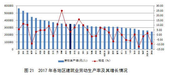 2017年,按建筑業總產值計算的勞動生產率排序前三位的地區是北京、上海和湖北。北京自2012年來連續6年領跑全國,2017年勞動生產率為564242元/人,比上年增長5.69%;上海2017年勞動生產率為532485元/人,比上年增長了11.40%;湖北2017年勞動生產率為506235元/人,比上年增長了10.34%。20個地區按建筑業總產值計算的勞動生產率有所提高,11個地區有所降低。增速超過10%的有吉林、山西、上海、貴州、湖北和遼寧6個地區(圖21)。