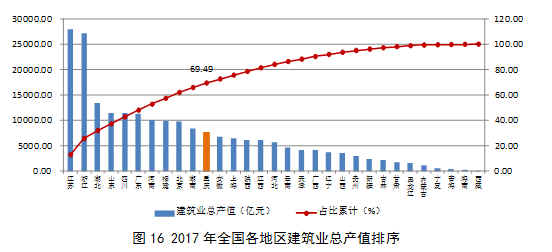 2017年,江蘇、浙江兩省依然領跑全國各地區建筑業,建筑業總產值繼續雙雙超過2.7萬億元,分別達到27955.95億元、27235.82億元,兩省建筑業總產值共占全國建筑業總產值的25.80%,比上年減少了0.43個百分點。