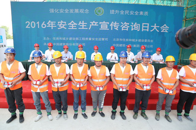 6月16日,住房城鄉建設部、北京市住建委聯合開展的全國建設系統“安全生產月”安全生產宣傳咨詢日活動,在中建一局天壇醫院遷建項目舉行。住房城鄉建設部副部長易軍,北京市委常委、副市長陳剛,住房城鄉建設部質量安全司司長李如生、副司長曲琦,北京市住建委主任徐賤云,中建總公司總經理、黨組副書記王祥明、安全生產監督管理局局長馬劍忠,中建一局董事長、黨委書記羅世威,中建一局總經理劉立新等出席活動,工人代表發出安全倡議。