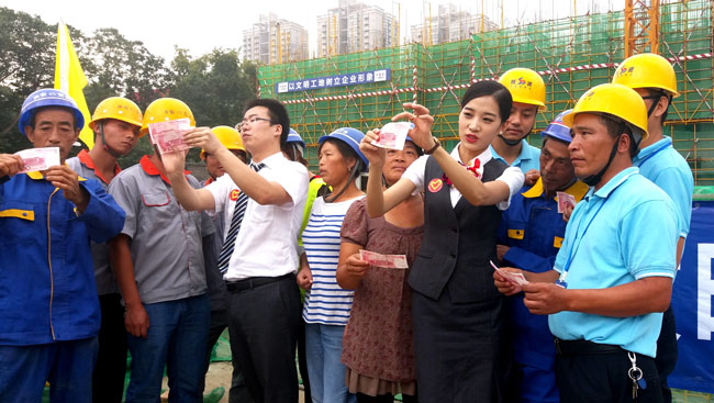 9月12日上午 ,在中秋節來臨之際,西安銀行總行營業部走進陜建八建集團西安外國語學院項目部,開展了“多一份金融了解,多一份財富保障”金融知識宣講暨我們的節日—中秋節活動,為農民工送知識、送祝福。