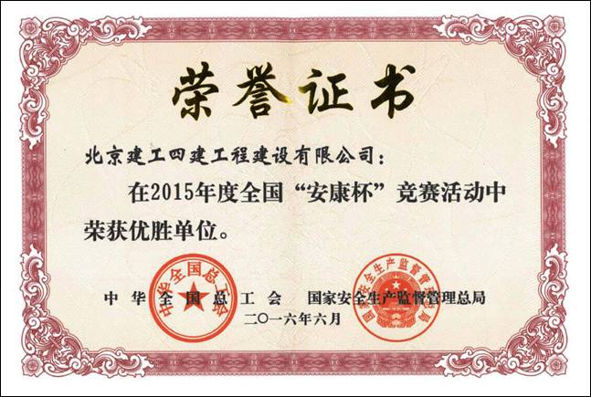 近日,由中華全國總工會、國家安全生產監管管理總局聯合舉辦的2014-2015年度全國“安康杯”競賽落下帷幕,北京建工四建工程建設有限公司被授予2014-2015年度全國“安康杯”競賽優勝單位榮譽稱號,系該公司歷史上首次獲此殊榮。