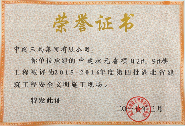 近日,由中建三局二公司基礎(chǔ)設(shè)施公司承建的中建•狀元府項(xiàng)目榮獲“2015-2016年度第四批湖北省建筑工程安全文明施工現(xiàn)場(chǎng)”。