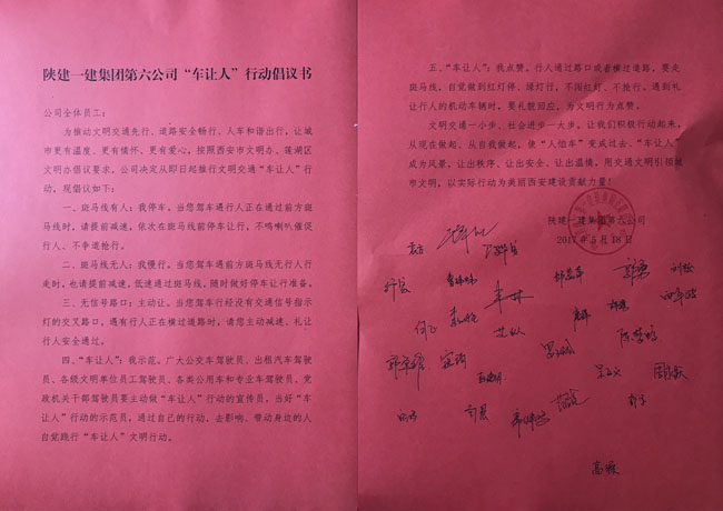陜建一建集團第六公司作為市級文明單位,為進一步提升城市文明程度,讓城市更有溫度、更有情懷、更有愛心,按照西安市文明辦、蓮湖區(qū)文明辦倡議要求,公司決定從即日起推行文明交通“車讓人”行動,發(fā)起“車讓人”倡議活動,從公司機關領導帶頭做起,簽訂倡議書,承諾文明出行。