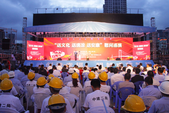 8月29日下午,中建二局“三送”巡訪慰問活動(dòng)走進(jìn)六盤水,為千余名農(nóng)民工送清涼、送文化、送安康。貴州省總工會(huì)副主席楊杰,中建二局副總經(jīng)理程同普,六盤水市市委副書記、市委政法委書記魏雄軍,六盤水市人大常委會(huì)副主任、市總工會(huì)主席劉靜等領(lǐng)導(dǎo)出席活動(dòng),約1000人參加此次活動(dòng)。
