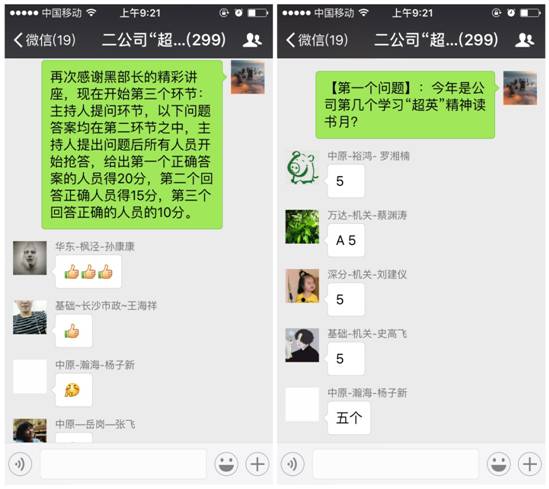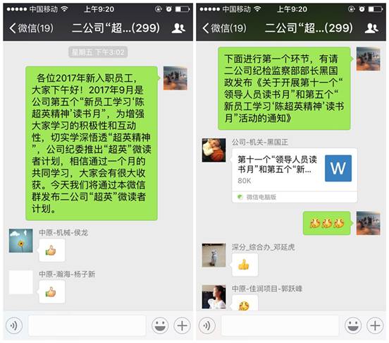 今年9月份是二公司第五個新員工學習“陳超英精神”讀書月,相比以往,今年通過微信群發(fā)布“超英微讀者計劃”活動,作為二公司首次推出的基于微信社群的讀書活動,“超英微讀者計劃”一經推出即贏得了廣泛好評,新員工紛紛點贊,踴躍參加。活動通過發(fā)布每日話題,開展主題討論,邀請公司領導、優(yōu)秀業(yè)務骨干開展專題講座、互動交流及知識問答等環(huán)節(jié)增強整個活動的趣味性,應用微信管家輔助軟件記錄群成員的活躍情況,并通過“微積分”方式建立學習成長卡,作為后期“超英微讀者計劃”閱讀小達人評選依據(jù),切實增強全員閱讀的積極性。