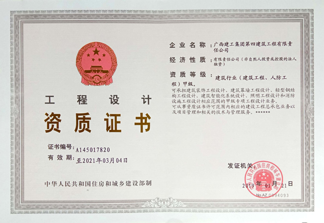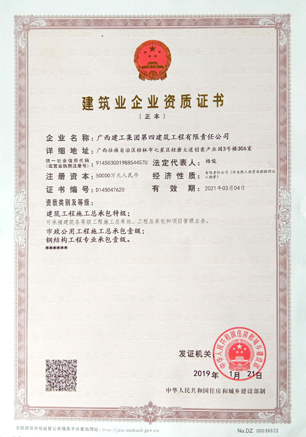 1月24日,廣西建工集團第四建筑工程有限責任公司捧回了建筑工程施工總承包特級資質和建筑行業(yè)(建筑工程、人防工程)兩項甲級設計資質證書。這標志著廣西建工四建取得了進軍建筑工程高端市場的通行證,從此邁入了建筑施工行業(yè)“特級方陣”。