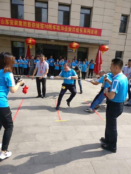“加油、加油”伴隨著一陣陣加油吶喊聲,山東省工業設備安裝集團有限公司舉辦的“喜迎建國70周年,我與企業共成長”系列活動暨拔河項目于9月25日上午在總部機關小廣場隆重拉開了序幕,來自總部機關近一百名職工采用現場抓鬮隨機組成8個方隊,比賽采用“三局兩勝”制,經過緊張激烈的19場回合的較量,其中2、4、6隊分別獲取了一、二、三等獎,并由全體職工組成了“70”方陣圖案和合唱《我和我的祖國》,以實際行動為共和國70華誕獻上了一份真誠祝福。