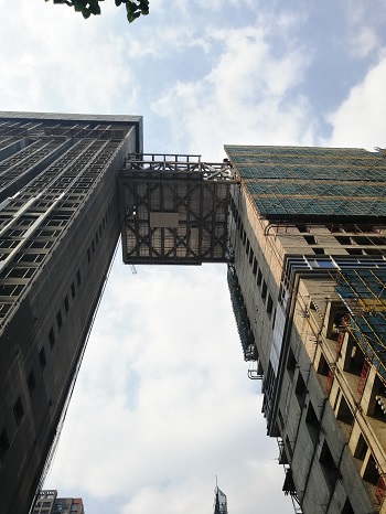 深圳海境界家園二期項目BC連廊是鋼桁架結構形式,連廊長26m,寬22m,高16m,總重量近千噸,屬超危大工程,也是本項目施工過程中最大的重難點,如此重量和高度的提升尚屬首次,沒有先例,分公司項目部高度重視,為了確保連廊吊裝一次到位,項目部成立以項目經理為組長,項目總工為副組長,協(xié)調組長、技術組長、安全組長、吊裝焊接組長、監(jiān)測監(jiān)控組長、保障組長組成的吊裝小組。施工過程中,多次對鋼結構設計進行優(yōu)化、深化,對焊接質量進行探傷試驗,對鋼結構實體重量,預埋吊點承重,進度節(jié)點,吊裝時間,天氣預報等全方位進行綜合考慮,多次BIM演示,實戰(zhàn)演練,受到業(yè)主、監(jiān)理、設計一致認可,均達到設計要求。僅吊裝內部交底達三次以上,在吊裝的前一天,在安長彪副總工的見證下,又組織相關人員進行一次現(xiàn)場交底,在原有交底基礎上做了補充,將原監(jiān)測頻次修改成10m、50m、80m三次過程監(jiān)測。對吊裝過程要發(fā)生的位移、變形、監(jiān)測、記錄等問題進行預判,統(tǒng)一處理意見。對每位組長的崗位流程進行口頭提問,確保人人心中有數(shù)。要求所有參與人員分工明確,協(xié)同作戰(zhàn),一切行動聽指揮。確保吊裝萬無一失,平穩(wěn)安全一次到位。