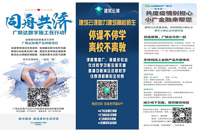 在防疫期間,廣聯(lián)達為企業(yè)提供移動辦公、項目資料管理、跨方協(xié)作、BIM成果應(yīng)用,以及運行環(huán)境安全檢測、視頻會議系統(tǒng)、開放遠(yuǎn)程任務(wù)及數(shù)據(jù)流轉(zhuǎn)統(tǒng)計、精品課程實訓(xùn)等免費服務(wù),幫助企業(yè)解決實際問題。幫助受疫情影響生產(chǎn)經(jīng)營受困的小微企業(yè),以提供信用貸款等多種形式,幫助企業(yè)減輕付款壓力、恢復(fù)生產(chǎn)運營。同時,推出復(fù)工政策、風(fēng)險挑戰(zhàn)、專家連線、科技前瞻等多個“數(shù)字連線1+1”在線直播。