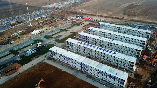起步就是沖刺,開局就是決戰(zhàn)。1月31日晚8點,接到用10天時間建成西安市公共衛(wèi)生中心辦公生活區(qū)的命令,陜建集團迅速成立了以張義光為總指揮的項目建設(shè)領(lǐng)導(dǎo)小組,連夜調(diào)派陜建機施集團、一建集團、產(chǎn)投集團、物流公司、混凝土公司五家單位進場。2月1日,2400余名施工人員和150多臺機械全部集結(jié)到位。2月2日,設(shè)計圖紙確定,項目大會戰(zhàn)正式打響。2月4日,僅用100個小時完成箱房首吊。2月6日,水塔鋼結(jié)構(gòu)支架安裝完成,化糞池安裝到位,室外停車場草皮磚鋪設(shè)完成,全部箱房吊裝完畢。2月9日晚十點,經(jīng)過9天9夜、216個小時的不間斷鏖戰(zhàn),提前一天完成施工任務(wù)并交付使用。