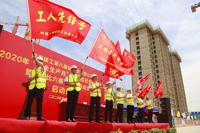 5月29日,陜建八建集團2020年“安全生產月”“雙百日安全”活動暨“六比六賽”主題勞動競賽啟動儀式在西安國際港務區新筑新城二期項目隆重舉行。集團黨委副書記、總經理王勛宣布啟動儀式。集團副總經理帖華作動員講話。集團生產管理部部長劉彥主持儀式。