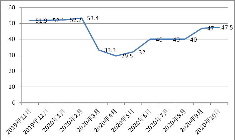 美國建筑師學會發布的建筑營業額指數(ABI)顯示了9到12個月之后的建筑支出,即新開工商業項目指數,是衡量建筑業健康與否的一個指標,若數值超過50,則表明營業額增長。